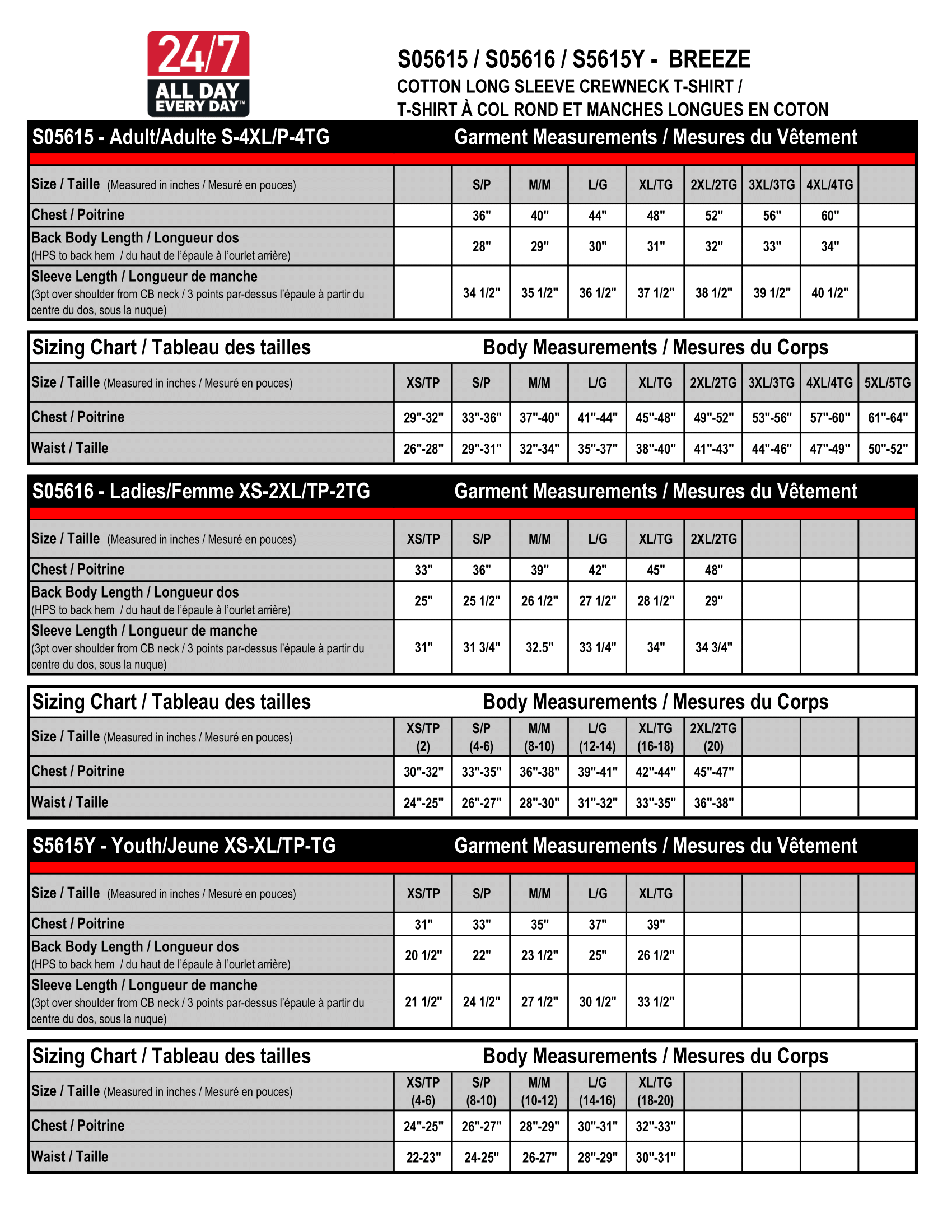 160 gsm - 4.7 oz./yd² - 8 oz./lin. yd (solids) 100% ring spun combed cotton jersey, (heathers) 65% cotton, 35% polyester jersey. 30 single yarn. Rib knit neckline and cuff with spandex for shape retention. Jersey knit back neck and shoulder tape. Tear away label.